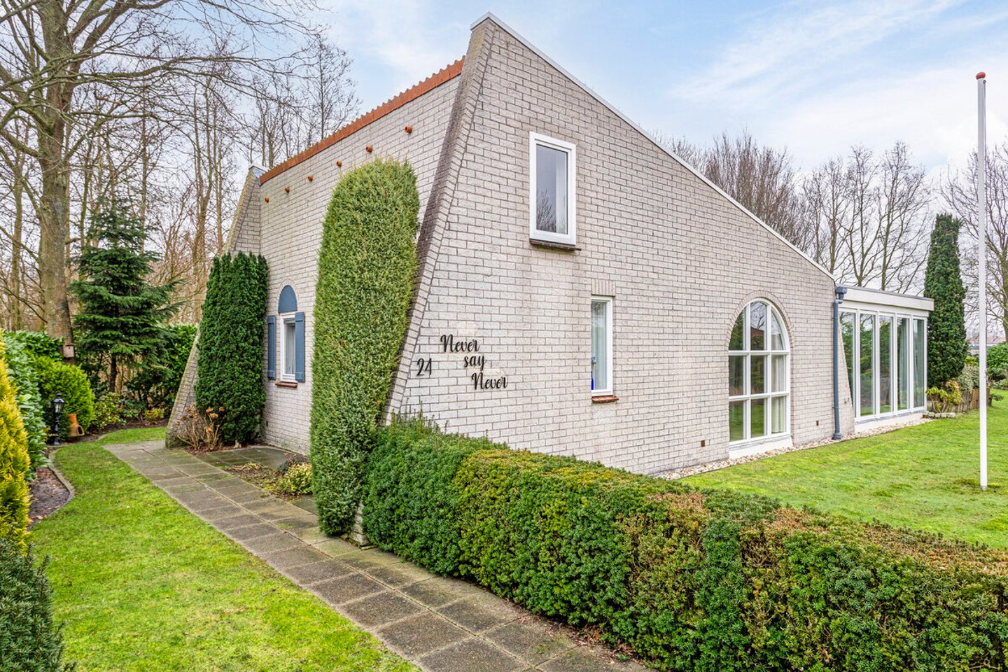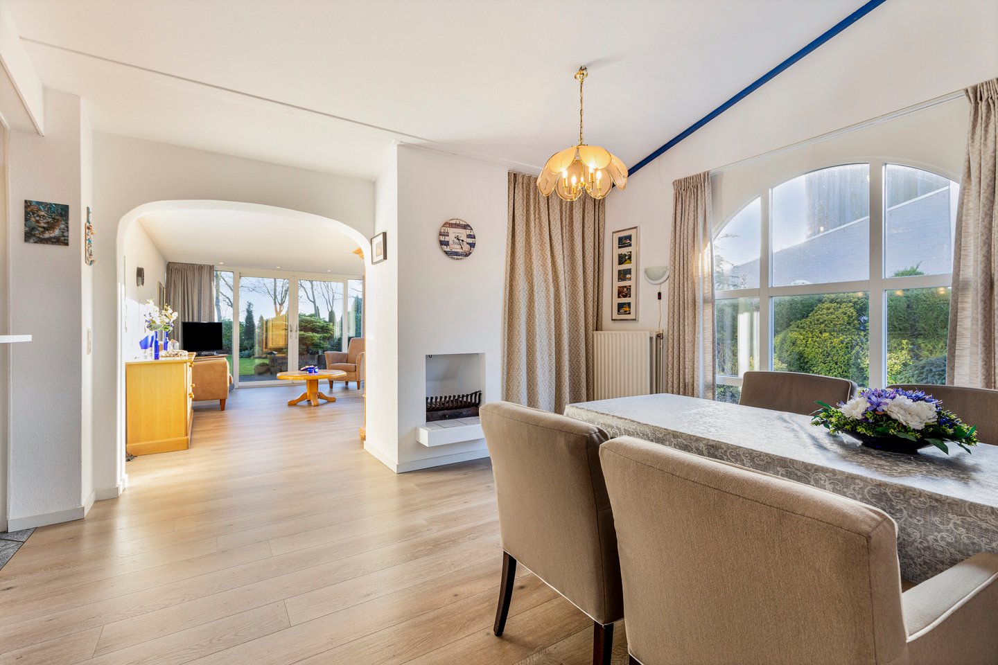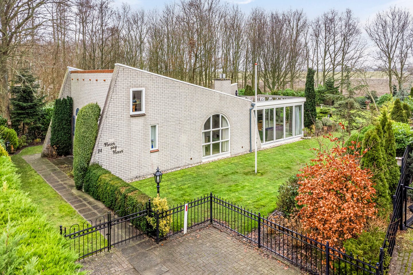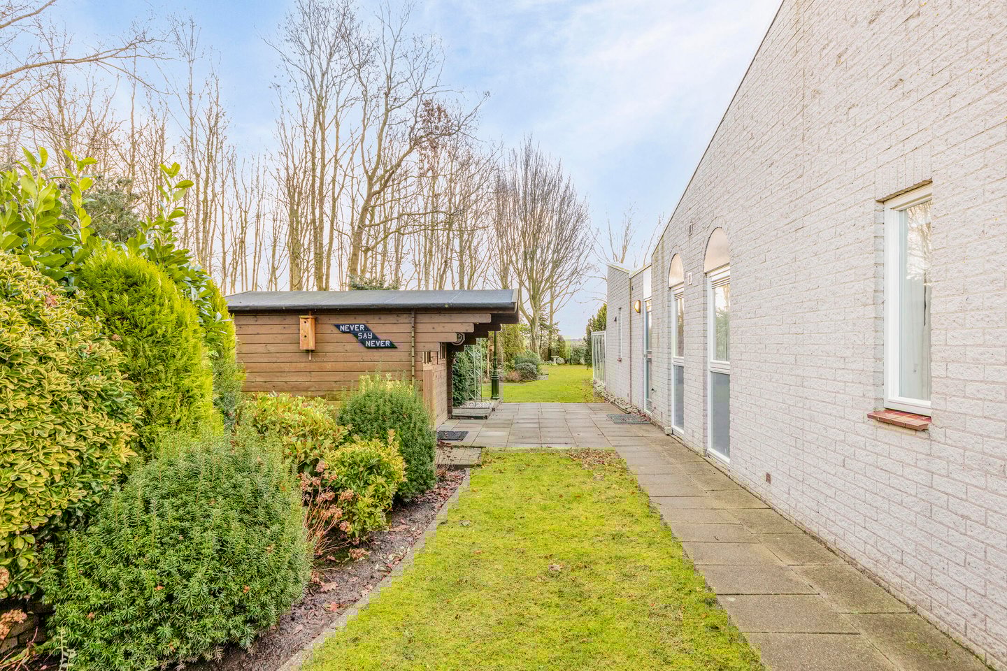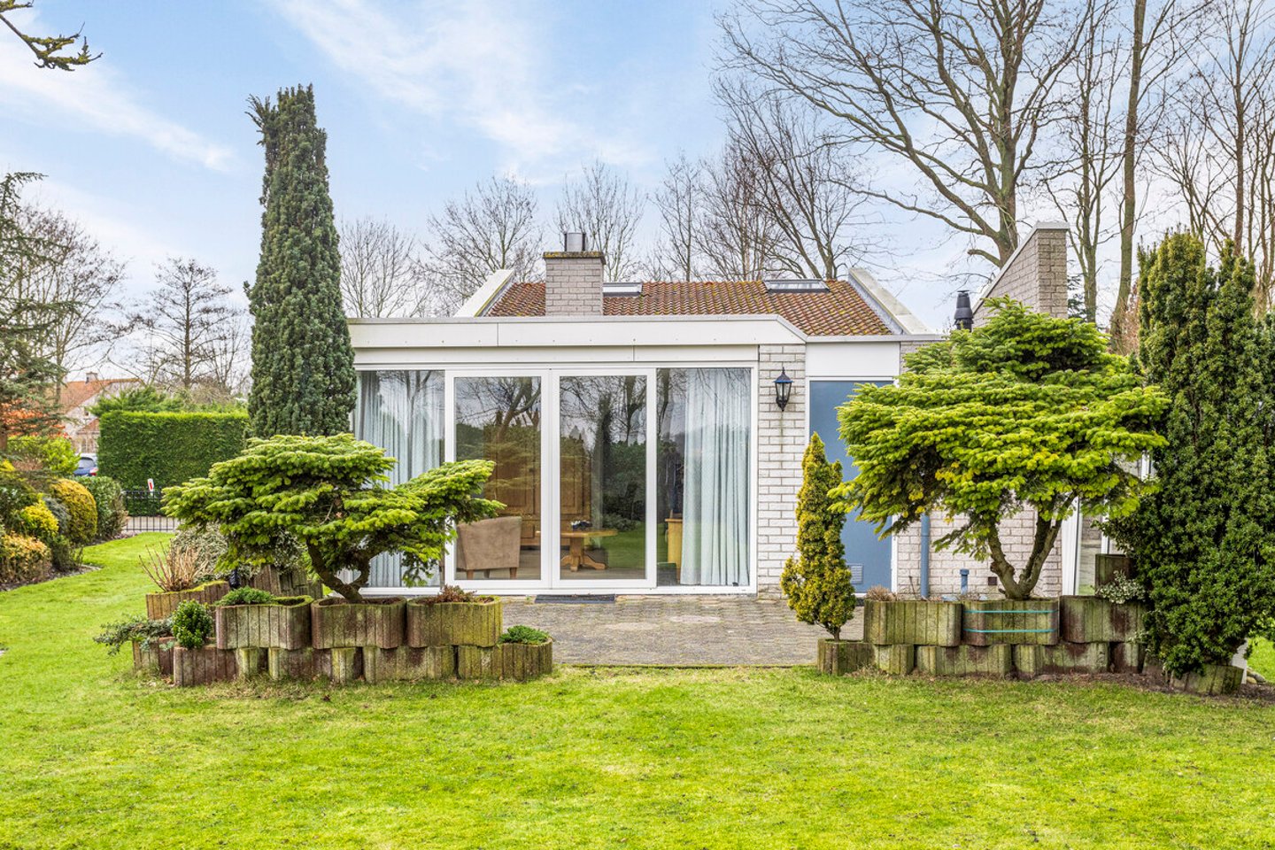 Blick auf den Garten und die umliegenden Felder, mit der Sint-Nicolaaskerk in der Ferne.