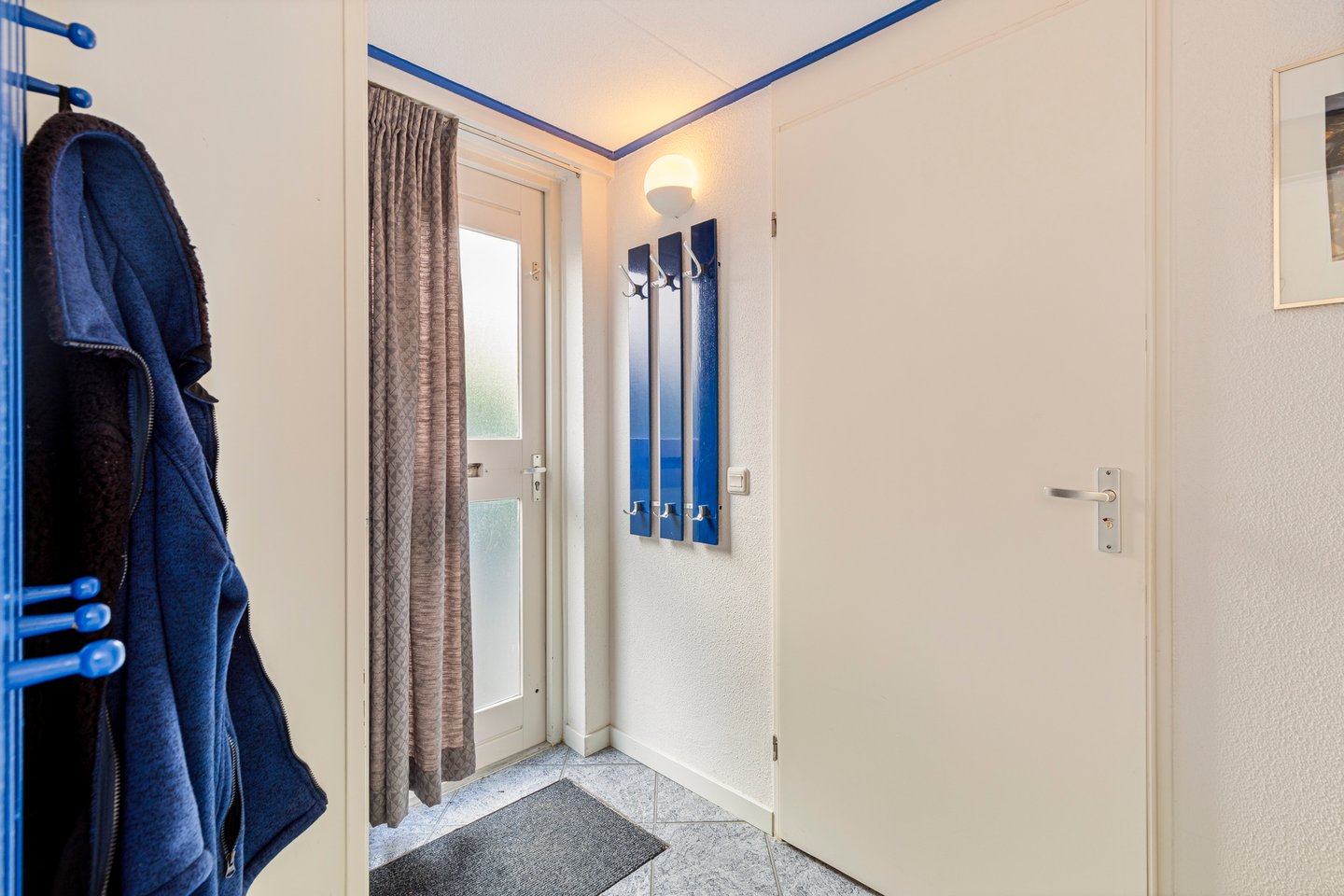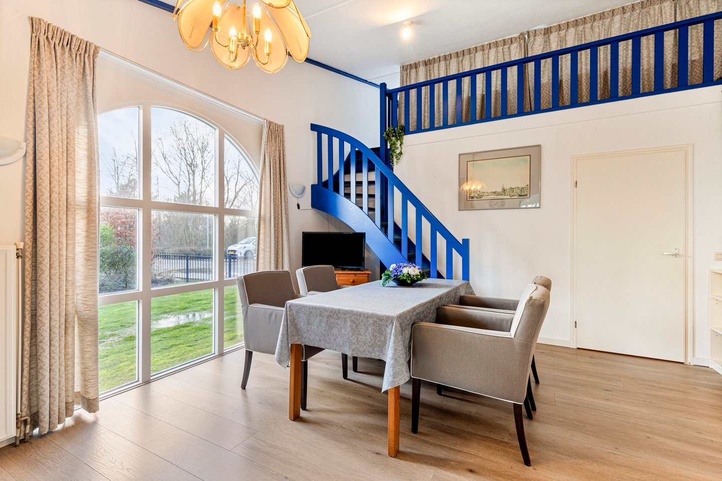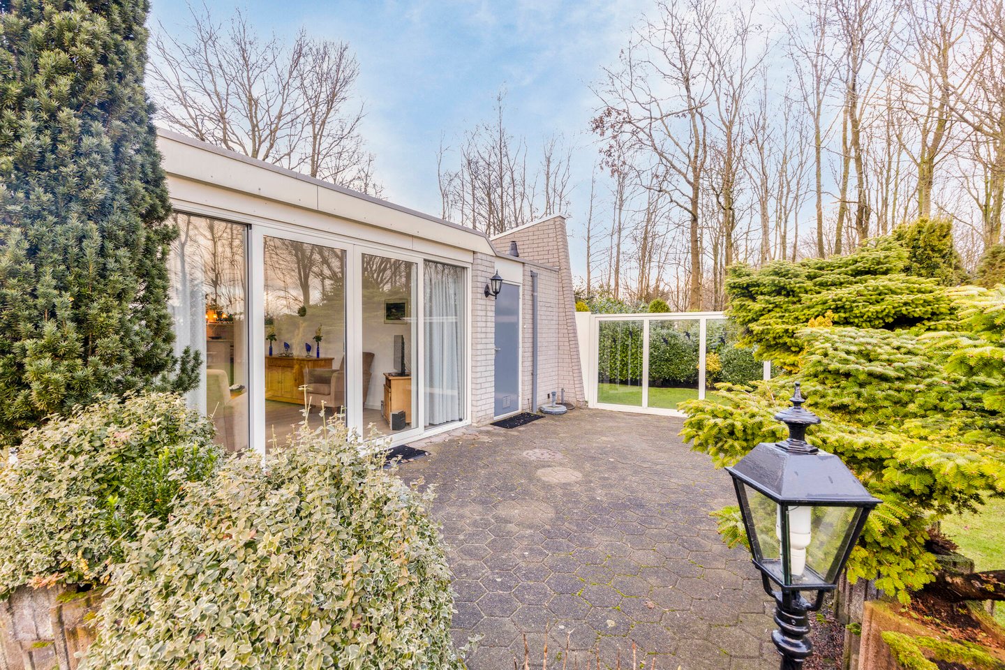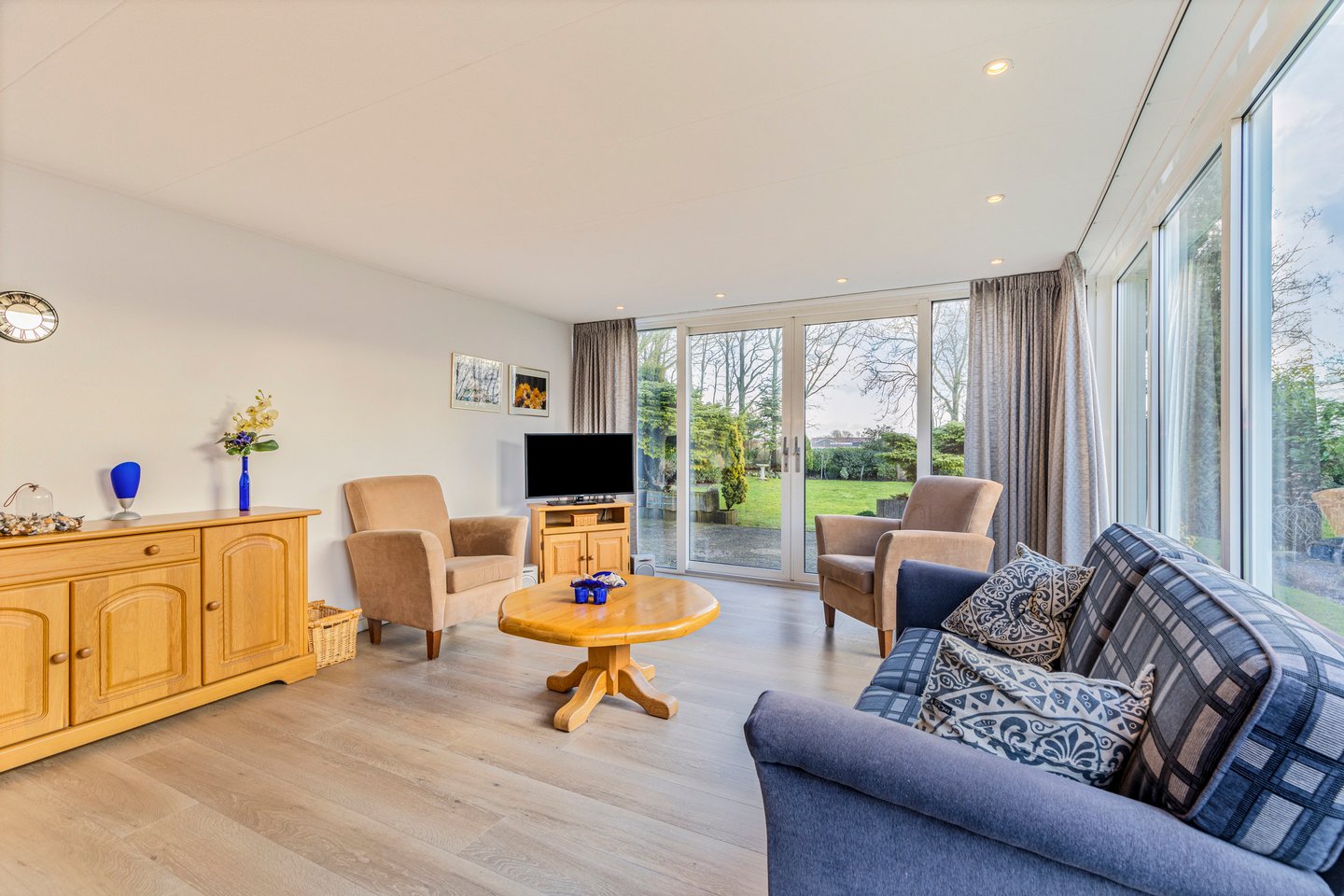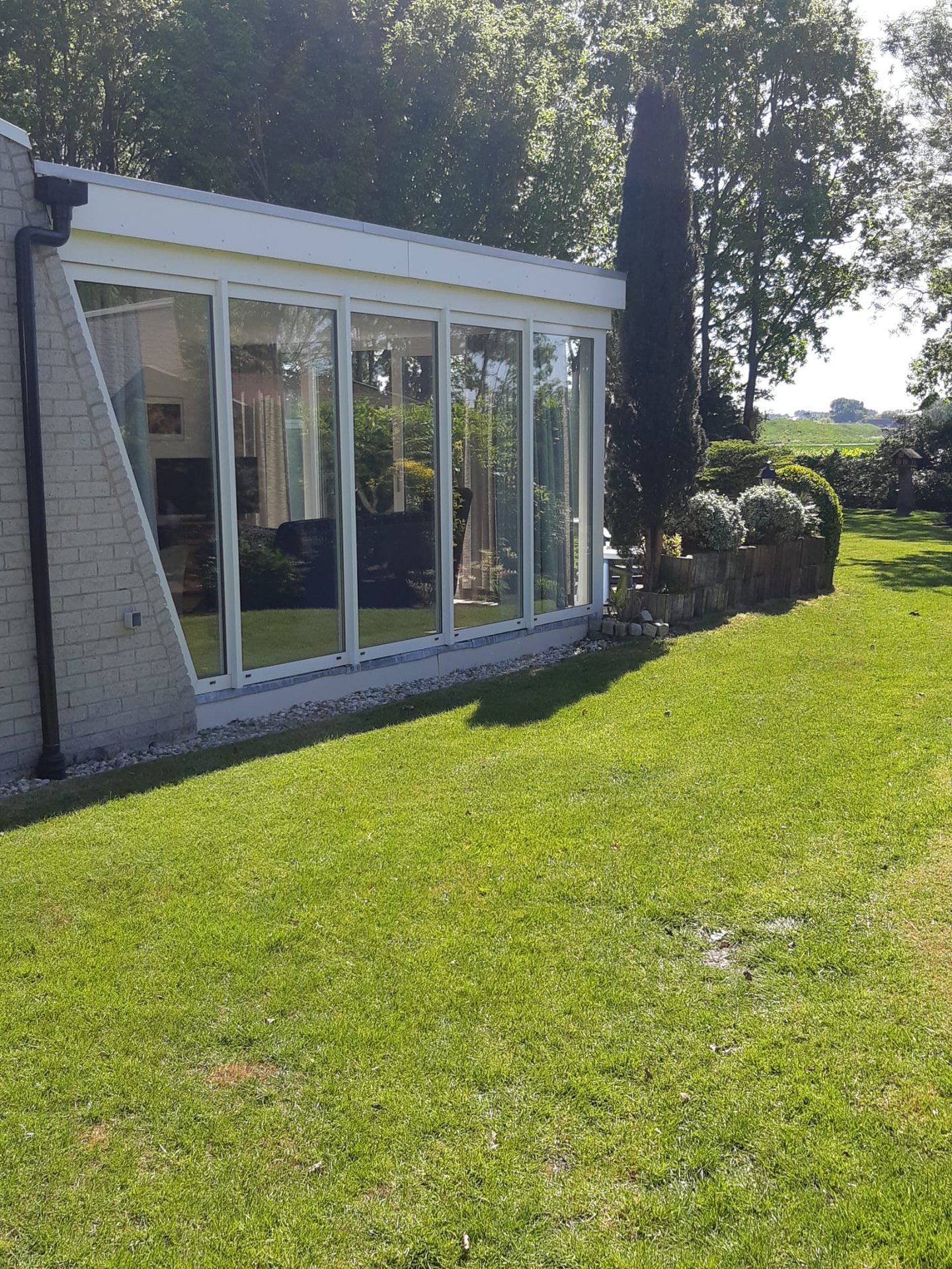 Blick auf den Garten und die umliegenden Felder, mit der Sint-Nicolaaskerk in der Ferne.